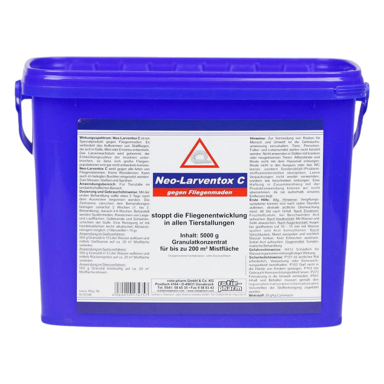 Neo-Larventox C ist ein Spezialprodukt gegen Fliegenmaden in Tierställen im landwirtschaftlichen Bereich. Es verhindert zuverlässig die Entwicklung von Fliegenmaden in Gülle, Mist oder Einstreu, indem das Larvenwachstum gehemmt und der Entwicklungszyklus unterbrochen wird. Neo-Larventox C wirkt gegen alle Arten von Fliegenstämmen und kann auch in belegten Buchten eingesetzt werden. 5.000 g Granulat reichen für 200 m² zu behandelnde Mistfläche.