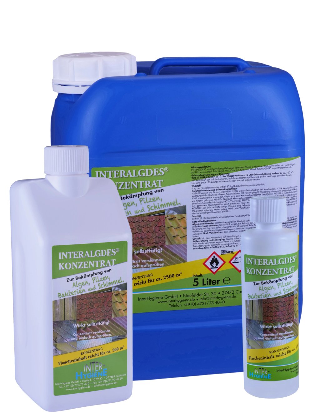 Das Interalgdes Konzentrat ist ein Algen- und Schimmelentferner und bieten Oberflächen einen effektiven Schutz gegen Biofilme und Mikroorganismen. Es reinigt noch kraftvoller durch einen integrierten Schmutzlöser sowie langanhaltend und vorbeugend gegen einen Neubefall.