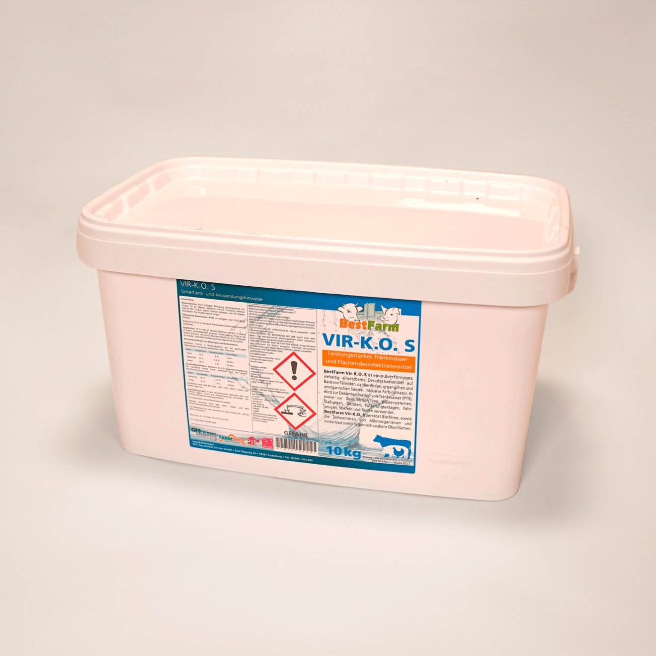 Vir-K.O. S ist ein leistungsstarkes Tränkwasser- und Flächendesinfektionsmittel auf Basis von Tensiden, oxidierenden, organischen und anorganischen Säuren, inklusive Farbindikator. Das pulverförmige Desinfektionsmittel kann zur Dekontamination von Tränkwasser sowie zur Desinfektion von Wassersystemen, Stallungen, Geräten, Fütterungsanlagen, Fahrzeugen, Stiefeln und Reifen verwendet werden. Vir-K.O. S zerstört Biofilme sowie die Zellmembran von Mikroorganismen und hinterlässt somit hygienisch saubere Oberflächen. Das Mittel zeichnet sich durch seine starke Desinfektionsleistung aus.