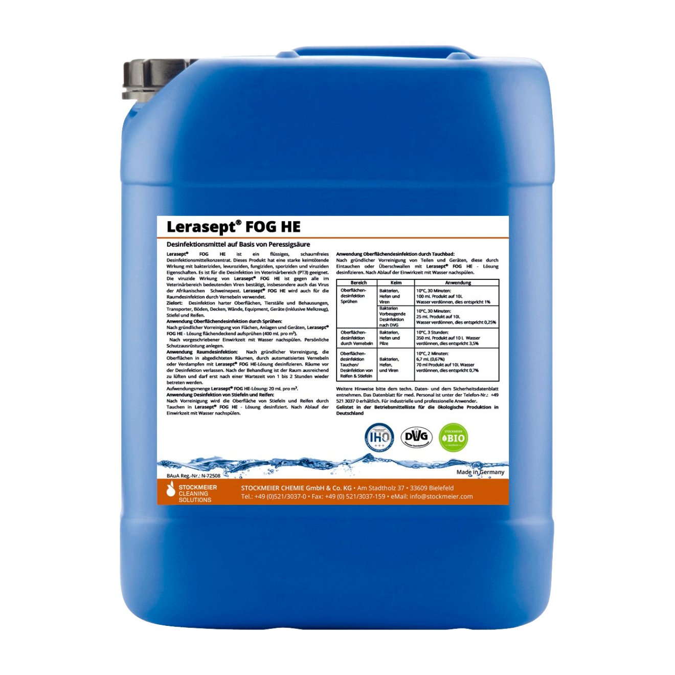 Lerasept® FOG HE ist ein flüssiges, stabilisiertes Desinfektionsmittel auf Basis von Peressigsäure zur professionellen Anwendung in der Veterinärhygiene. Das Produkt ist schaumfrei formuliert, auch im Kaltbereich hochwirksam und eignet sich für die zuverlässige Bekämpfung aller relevanten Mikroorganismengruppen.