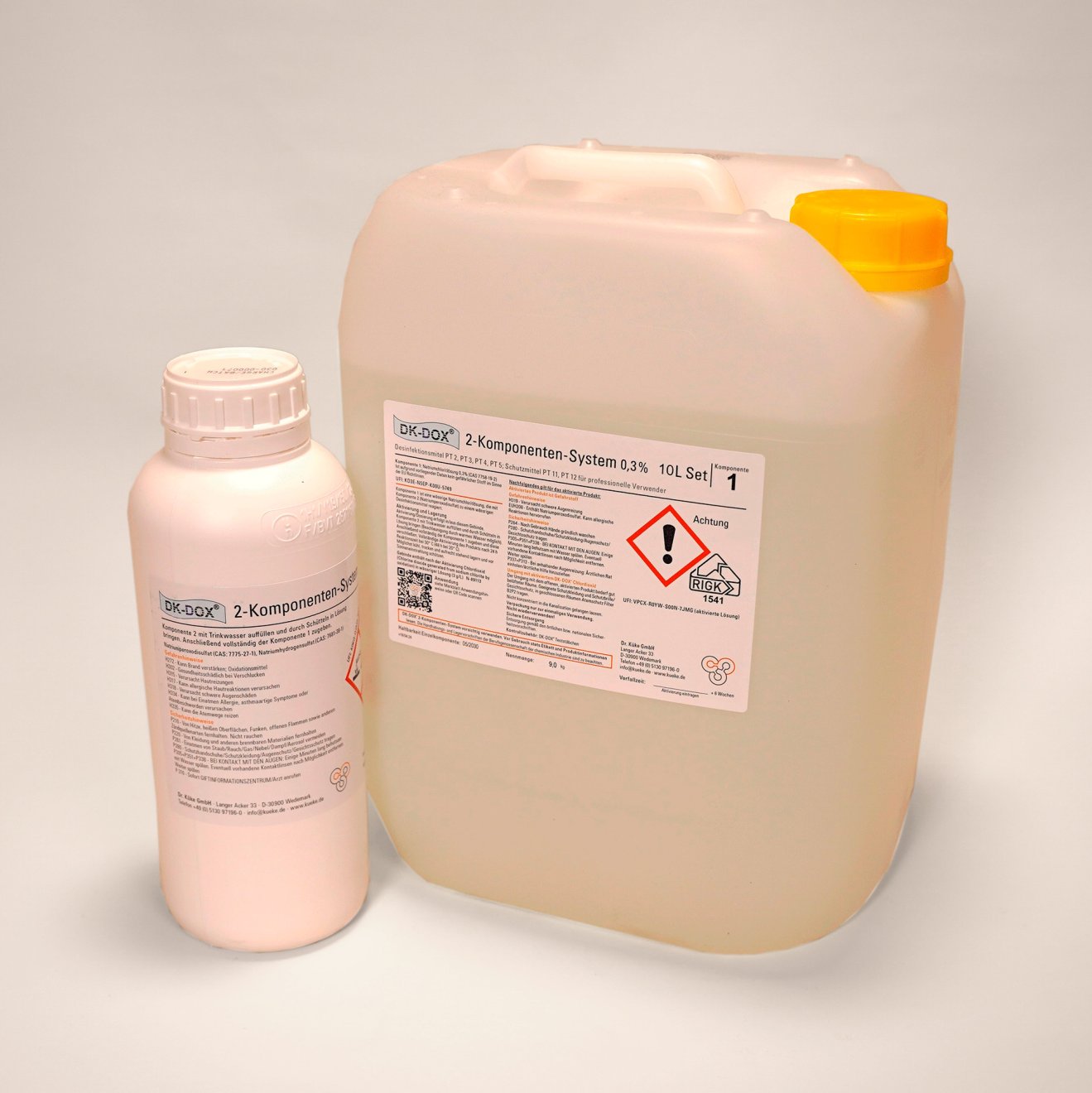 Das DK-DOX® 2-Komponenten System 0,3% ist im Handmischverfahren im Trinkwasser für den Menschen und im Tränkewasser zur Bekämpfung von pathogenen Keimen, Bakterien, Pilzen, Algen und Viren zugelassen. Das Produkt besteht aus zwei Komponenten zur Herstellung einer 0,3%igen Chlordioxidlösung. Die Chlordioxidlösung ist 6 Wochen lagerfähig/dosierbar, sehr materialschonend und chlorfrei. Nicht aktiviert sind die beiden komponenten 5 Jahre lagerstabil (kühl und UV-geschützt). DK-DOX kann sowohl zur Grunddesinfektion der Leitungssysteme (leerer Stall) als auch zur Desinfektion von Trink- und Tränkwasser eingesetzt werden. Durch die Abtötung aller Schadkeime im Tränkwasser, kann die Arzneimittelzugabe reduziert, und die Tiergesundheit gefördert werden. DK-DOX® kennt keinerlei Resistenzen. Der Einsatz von DK-DOX® Chlordioxid hat keinen negativen Einfluss auf das Trinkverhalten der Tiere. DK-DOX® entspricht der neuen Trinkwasserverordnung (2023), DIN EN 12671, DVGW W224, W557, W291.