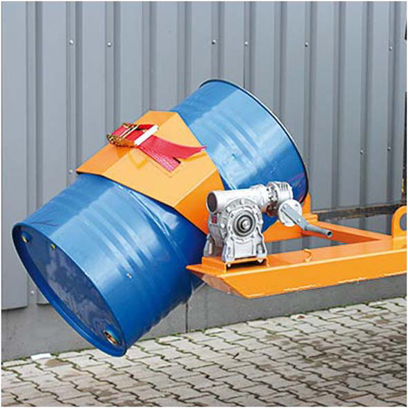 Der Fass- und Tonnenkipper ist ein Anbaugerät für den Stapler oder die Palettengabel und kann für viele Anwendungen im Betrieb eingesetzt werden. Hiermit lassen sich 200 l Fässer und Mülltonnen sicher transportieren und mit einer handkurbel kippen und ausleeren ohne mit dem Produkt in Berührung zu kommen.