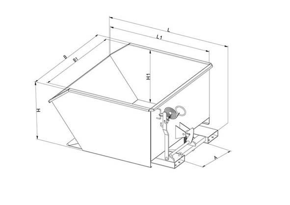 Der Kippbehälter in niedriger Bauhöhe dient dem Transport von Materialien mit einem Gabelstapler oder einer Palettengabel. Er verfügt über einen Seilzug, mit dem der Behälter durch die niedrige Bauhöhe bequem im optimalen Kippwinkel ausgekippt werden kann.