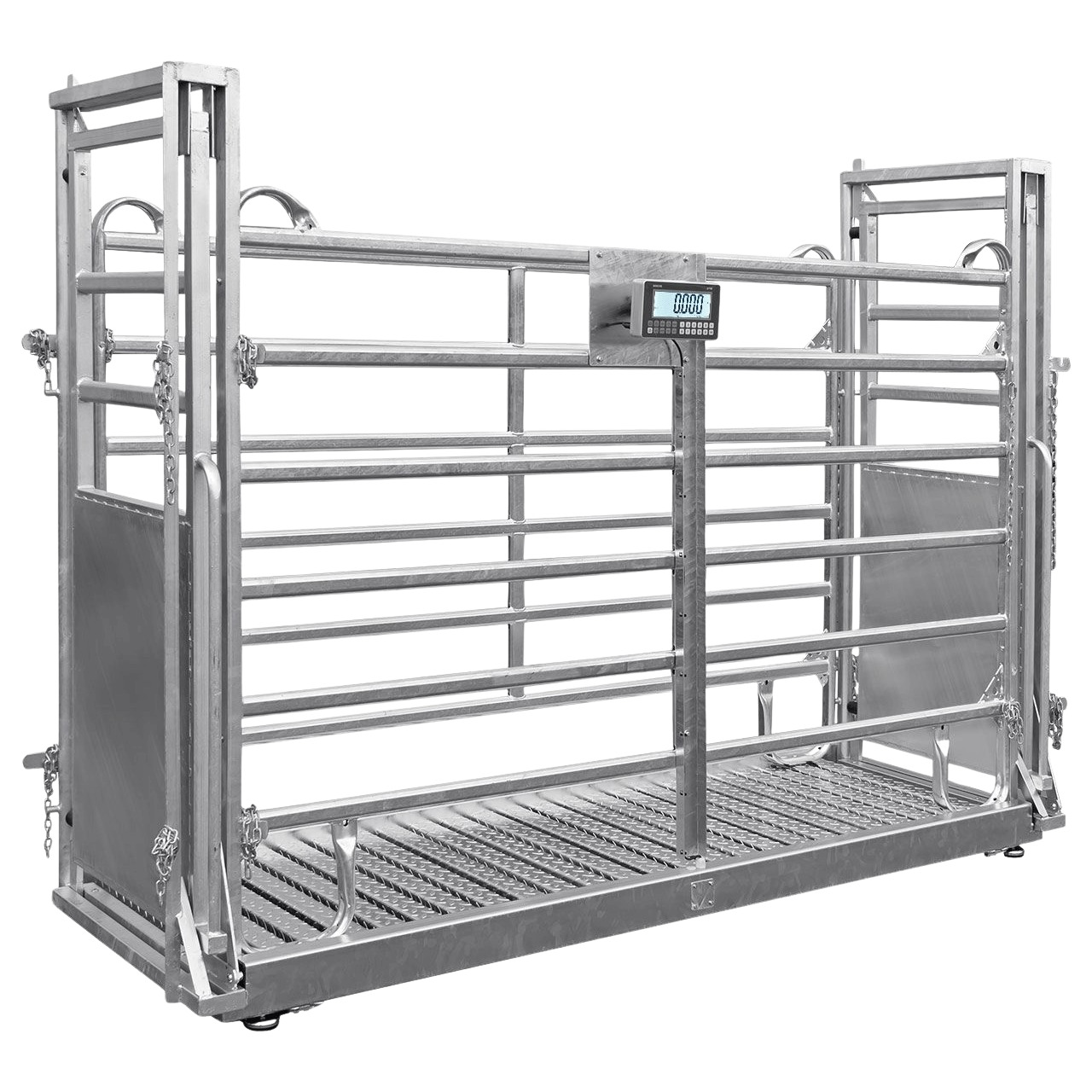 Die aus feuerverzinktem Stahl gefertigte Großtierwaage dient zum Wiegen von Bullen und Rindern. Die Waage verfügt über einen rutschfesten Boden mit durchlässigen Riffelblechplatten.