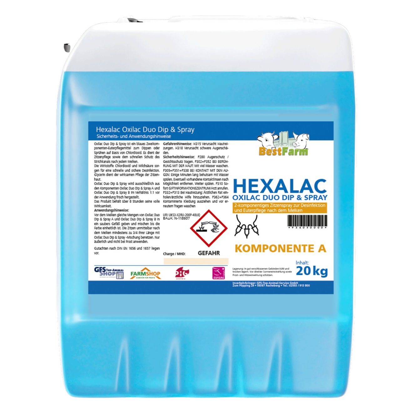 Das BestFarm Oxilac Duo Dip & Spray ist ein hochwirksames Zweikomponenten-Dipp- und Sprühmittel auf Basis von Chlordioxid. Es wurde speziell für die Euter- und Zitzenpflege sowie den schnellen Schutz des Strichkanals nach jedem Melken entwickelt.