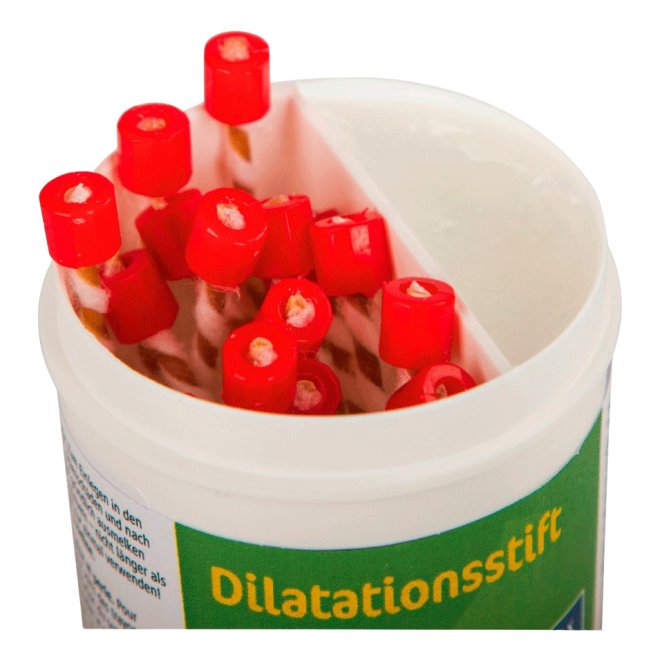 Der Dilatationsstift kann nach Verletzungen oder Operationen in den Strichkanal eingelegt werden, um Zitzenkanalverengungen vorzubeugen. Er wirkt dilatierend und saugend. Der Stift besteht aus einem Darmstift mit einem verstärkten Wollfaden. Er wird in einer Trennfachdose mit Vaseline geliefert.