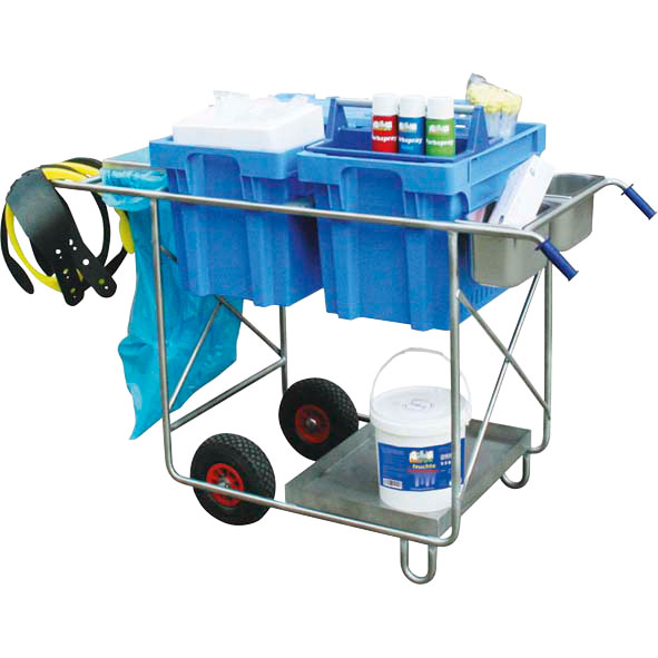 Der speziell entwickelte Besamungswagen auf dem alle zur Besamung notwendigen Artikel ihren Platz finden. Alle Hilfsmaterialien sind stets griffbereit. Er ist sehr leicht zu reinigen und zu desinfizieren. Leichte Handhabung durch die Verarbeitung von hochwertigem V2A-Stahl und der verwendeten Luftbereifung.